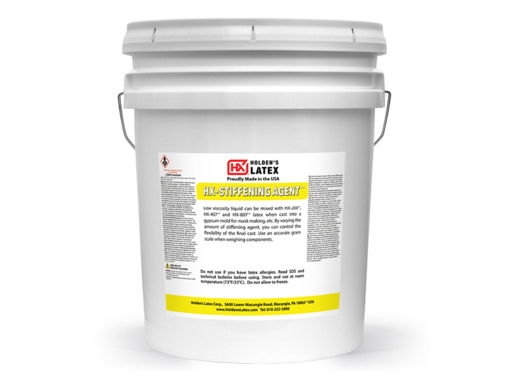 HOLDEN'S HX-STIFFENING AGENT is a one part, low viscosity, pourable liquid that when mixed into a casting or mask making latex, will increase the stiffness and reduce the flexibility of the cured latex. Varying levels of stiffness can be achieved in proportion to the amount of HX-STIFFENING AGENT added. HX-STIFFENING AGENT is compatible with HX-200 Casting Latex, HX-407 Mask Making Latex and HX-807 Brushable Casting Latex. These products are used only when casting into a gypsum mold. HX-STIFFENING AGENT offers versatility and control when using Holden's Latex products to make hollow cast objects, puppetry, theatrical scenery, mask making, etc.