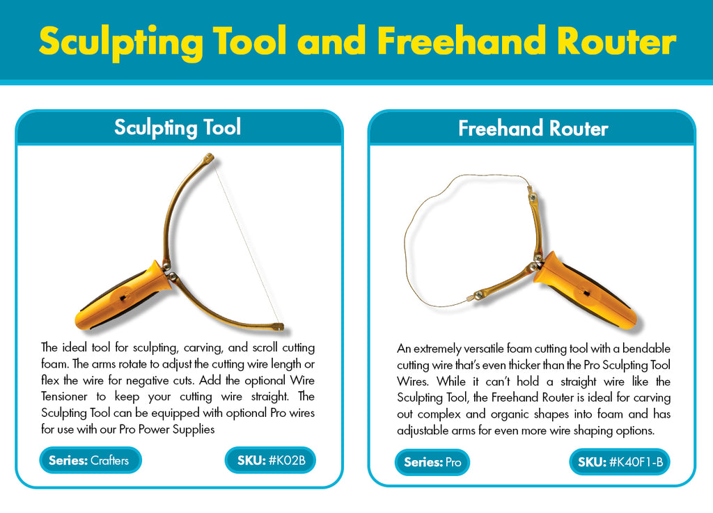 Hot Wire tool designed for freehand sculpting, carving, and scroll cutting in foam. Tool arms can be adjusted by moving closer together or fully spread to 8" opening. Includes: AC plug-in-the-wall power supply, Sculpting Tool, Instructional DVD with bonus featurette: Magic Mountains. Ships with 12 feet of tool cord!