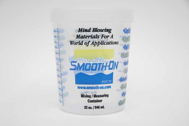 Plastic mixing container with graduated markings for accurate measurement of materials which are measured by volume.